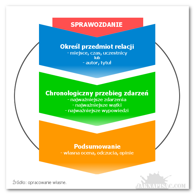 Sprawozdanie to przedstawienie przebiegu wydarzeń. Zawiera dokładne informacje o danym zdarzeniu i opinię autora.